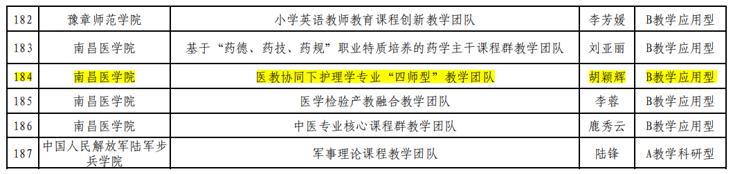 近日,江西省教育网上公示,我校葡京8883官网入口胡颖辉教授牵头的《医教协同下护理学专业“四师型”教学团队》获得江西省高水平本科教学团队(B教学应用型)立项。2022年全省高校共评选出187个高水平本科教学团队,我校共4个教学团队获批立项建设。