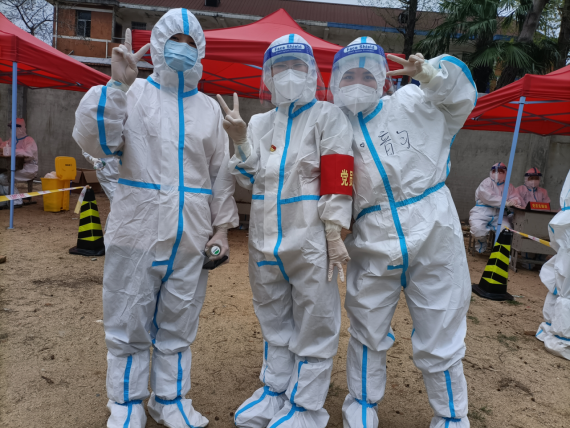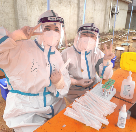 助产系妇产科专职教师赖文娟老师,家中上有老下有小需要照顾,两个小朋友都在家上网课,老二支气管肺炎在家雾化治疗。但在得知招募防疫工作志愿者的消息后,赖老师第一时间报名参加,支援八一乡核酸检测采样。
