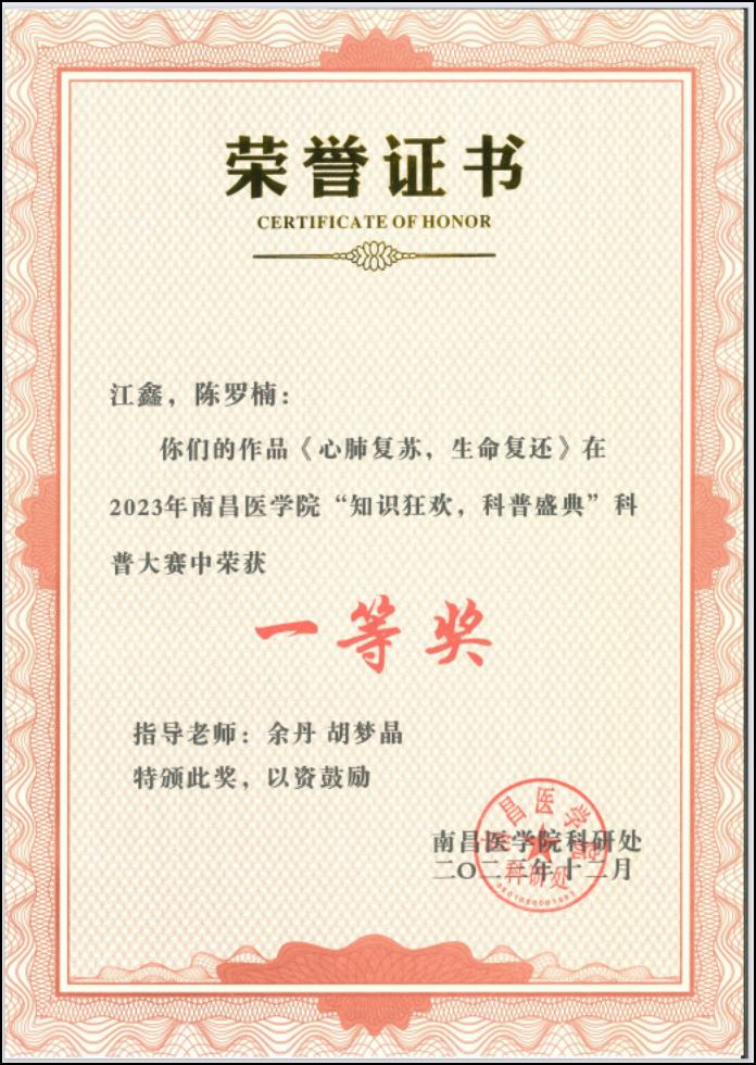 在科普大赛中,余丹、胡梦晶老师指导的学生江鑫、陈罗楠的作品《心肺复苏、生命复还》获得一等奖。