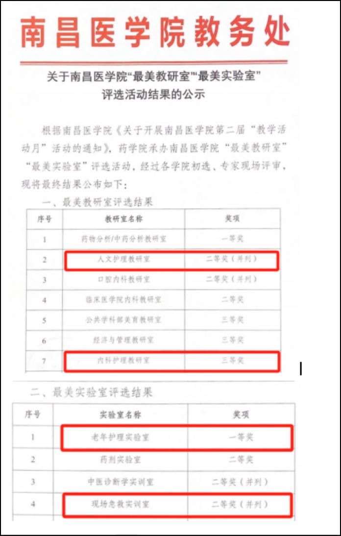 在“最美教研室”“最美实训室”评比大赛中,学院“人文护理教研室”“内科护理教研室”分别获得最美教研室二等奖和三等奖;老年护理实验室、现场急救实训室分别获得最美实训室一等奖和二等奖。