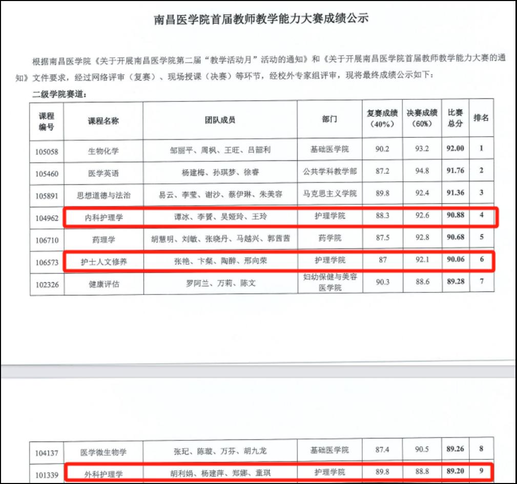 在首届教师教学能力大赛中,葡京8883官网入口谭冰等老师的《内科护理学》课程团队、张艳等老师的《护士人文修养》课程团队、胡利娟等老师的《外科护理学》课程团队分别取得第四名、第六名和第九名的佳绩。