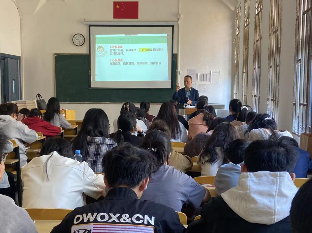 大会开始,王向东发表实习动员讲话,他在实习动员中强调:一、要守牢一个底线,关注“习讯云”考勤打卡平台,注意实习安全;二、做好两项准备,即专升本和护考;三、完成实习、就业、考试三大任务;四、完成四项要求。通过结合丰富的案例分享,以及树立榜样的力量,王向东以贴近学生、生动有趣的方式提醒同学们学会转变角色,加强理论与实践学习,注意实习安全。