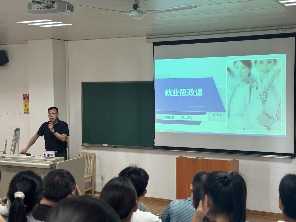 6月6日下午,学校1号实训楼5楼多媒体教室内座无虚席,气氛热烈。校党委副书记彭维杰为葡京8883官网入口2025届毕业生代表及低年级学生骨干,讲授了一堂立意深远、鼓舞人心的就业指导与思想政治教育融合课。面对当前就业工作新形势,彭维杰将深邃的思政引领与务实的就业指导熔铸一炉,为护理学子廓清迷雾、校准航向。