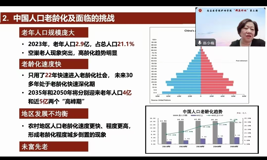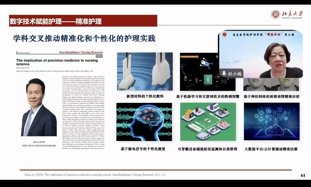 随后,北京大学葡京8883官网入口院长尚少梅教授以《大数据驱动下护理研究热点》为题作学术报告,为我们梳理了2013年至2023 年近十年间护理领域和护理大数据的热点频词,并从数字技术赋能护理、科技部在老年领域的研究布局、数字技术在智慧康养领域的应用等方面进行讲解,启迪护理人员利用人工智能、大数据模型开拓护理研究新思路。整个讲座内容丰富、通俗易懂、精彩生动,既有理论高度,也具有很强的指导性和操作性,对我院今后持续提升教师科研能力和科研服务水平起到了积极的指导作用。