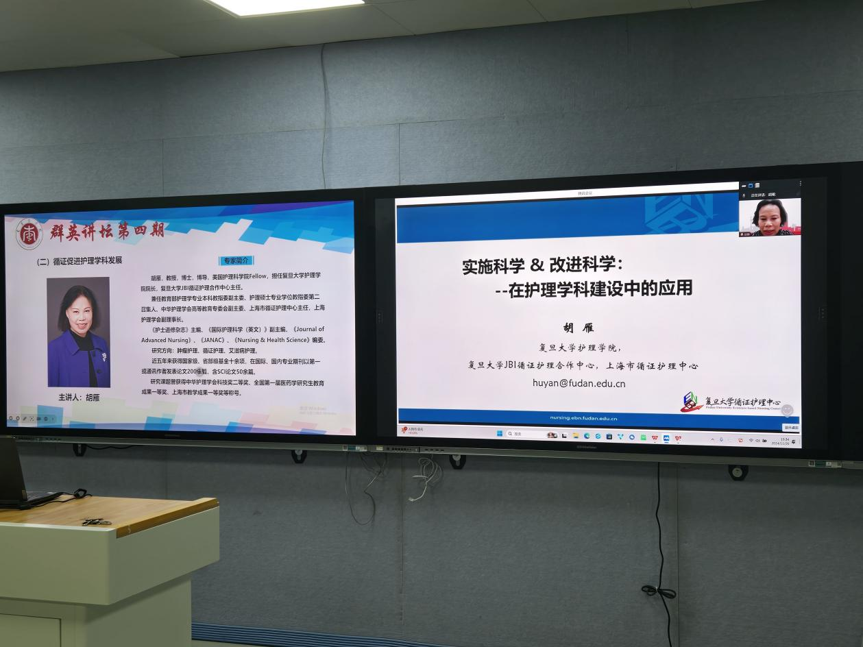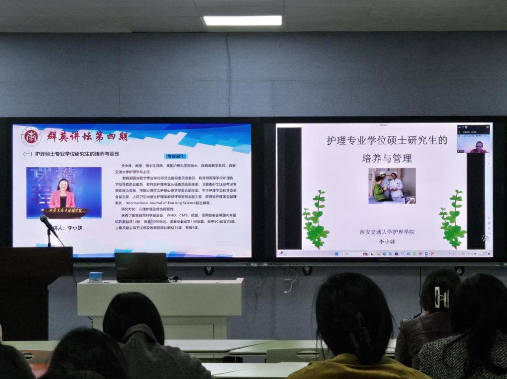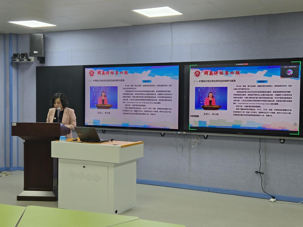 2024年11月20日下午,第四期“群英讲坛”学术讲座在葡京8883官网入口1号实训楼411智慧教室顺利举行。本次讲座特邀西安交通大学护理系主任李小妹教授、复旦大学葡京8883官网入口院长胡雁教授作专题报告。葡京8883官网入口和附属医院师生线上线下共计200余人参加学习。讲座由葡京8883官网入口副院长胡颖辉主持。